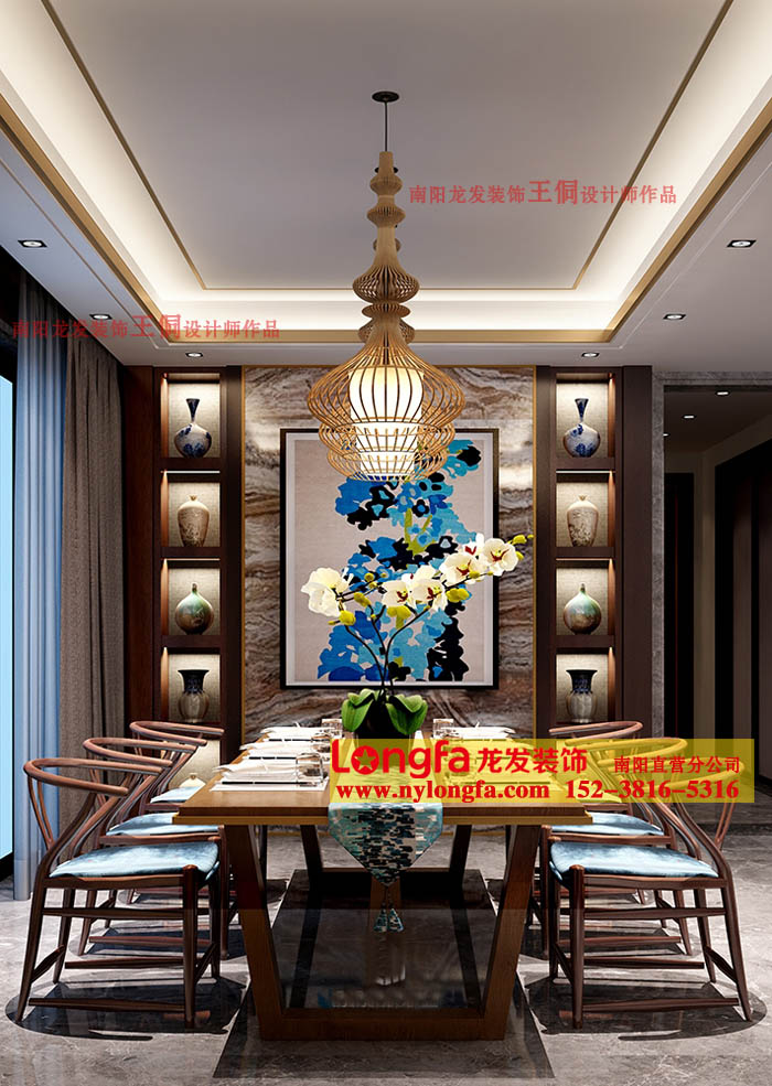 两个都是要求比较高的空间;对于装修来说,优秀的装修设计师,在这一套南阳桃花岛的装修,大型复式楼的装修,经典新中式风格,充分可以看到我们龙发装饰王侗设计师的实力;