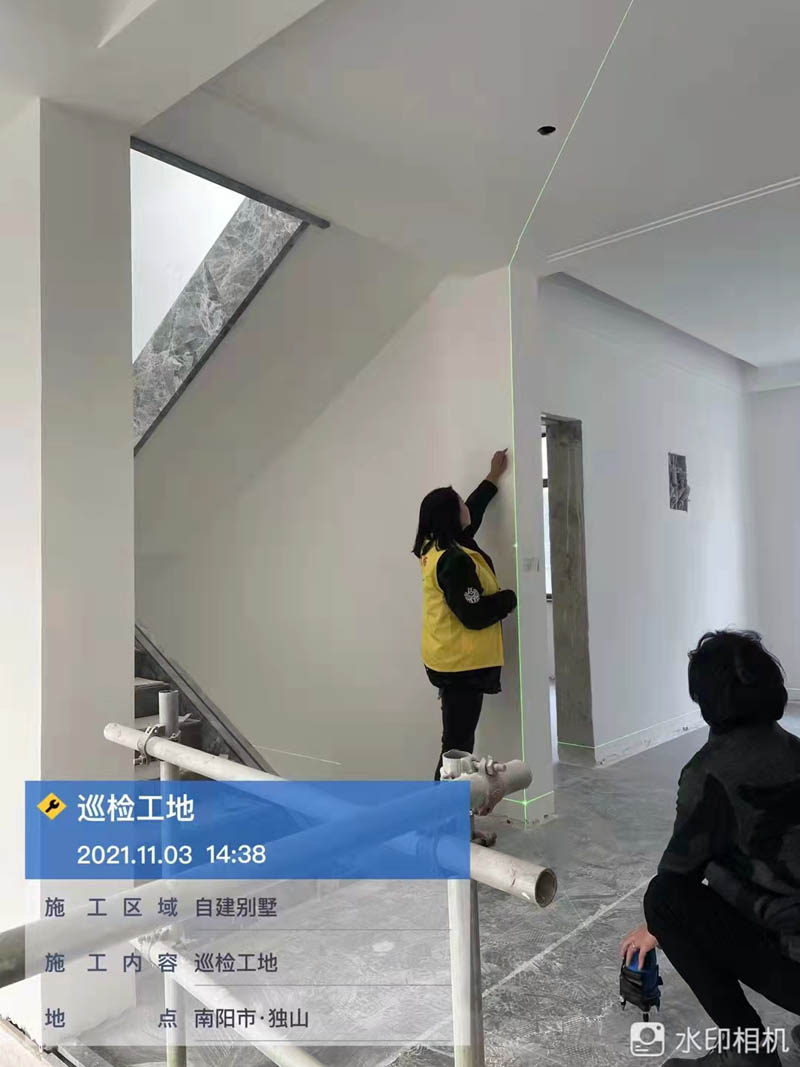 龙发装饰南阳分公司在自建别墅方面做的工地比较多,例如本套装修工地也是一套自建别墅,我们巡检人员对装修工地的进行巡检,图片中可以看到,通过设备仪器,检查阳角的垂直度。尽心尽责的对每一...