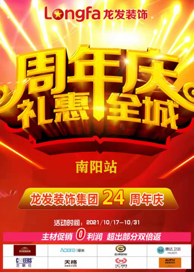 24年风雨历程,铸就品质龙发。24年披荆斩棘,奠定业界高峰。龙发装饰集团24周年庆—南阳站主材促销零利润,超出部分双倍返基础装修找龙发,您把幸福装回家...
