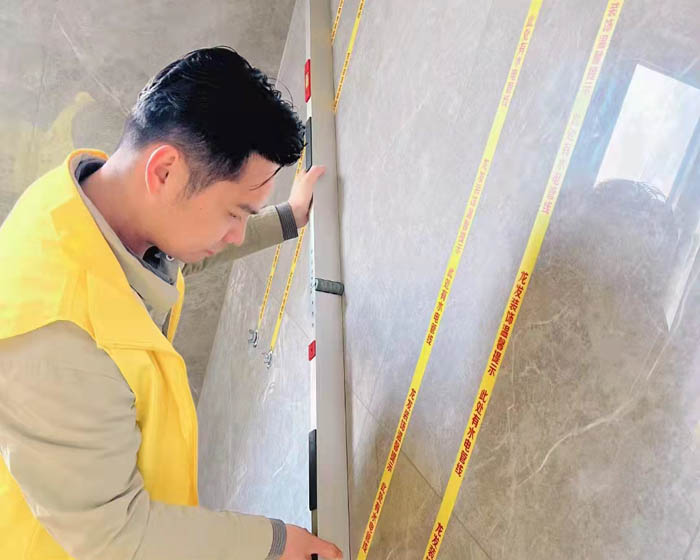 南阳常绿大溪地的瓷砖铺贴的阳角平整度检查瓷砖空鼓的检查三川玖龙台的瓷砖铺贴验收利用靠尺对墙面进行检查吊顶和造型门的木工施工对我们水电施工的电线材料的检查查看材料和细节南阳龙发装饰管...