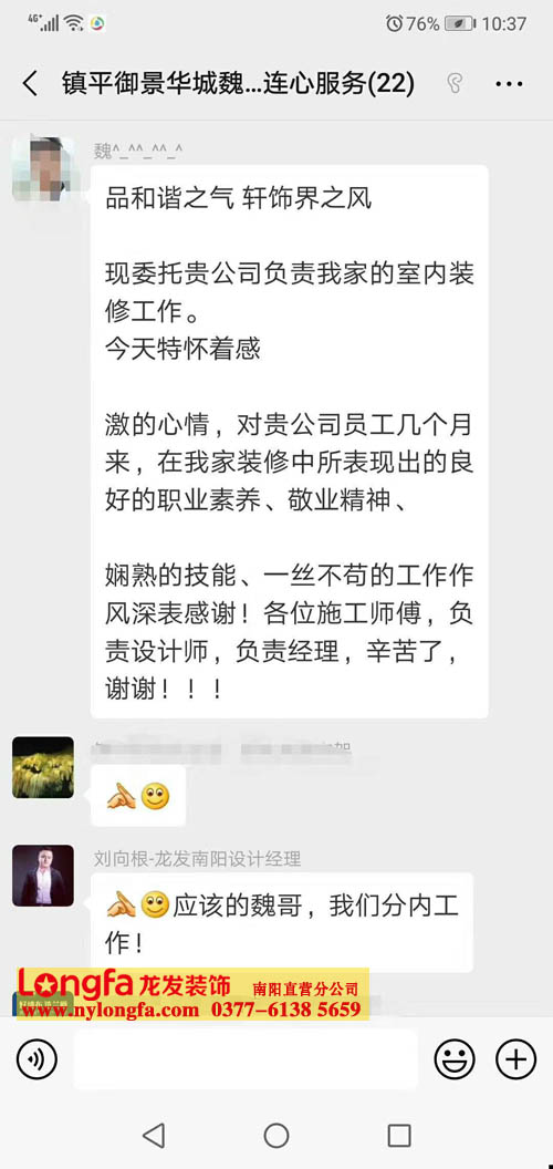 之前为大家公布过我们一些在御景华城小区的装修服务群,我们经理对客户的好的服务,业主的好评,都是我们后续能够继续签单和开工的重要因素,御景华城作为镇平县高端住宅小区,对品质的装修要求,也让龙发装饰得以为更多人提供装修服务!