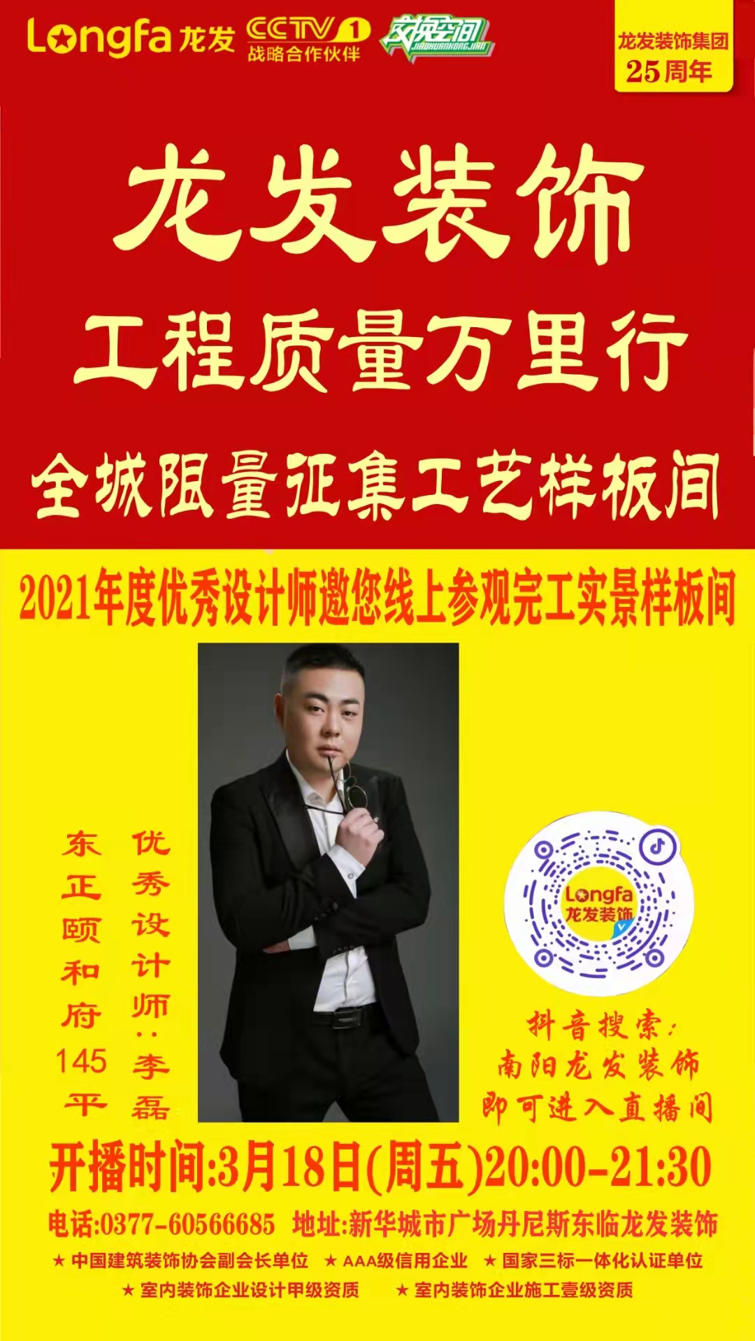 工程质量万里行-南阳站全城限量征集工艺样板间龙发装饰邀您线上参观东正颐和府145平方实景样板间 打开抖音搜索《南阳龙发装饰》今天20:00直播间不见不散开播时间:3月18日20:0...