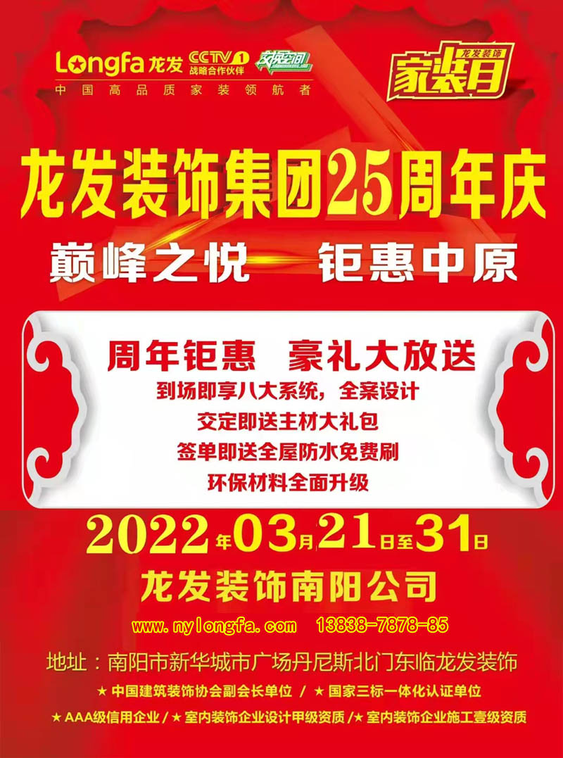 龙发装饰集团25周年庆 巅峰之悦 钜惠中原周年钜惠,豪礼大放送品质打响品牌,匠心成就精彩!龙发装饰专注品质家装25年!南阳龙发装饰公司本次活动,将会为您提供优质的服务!...