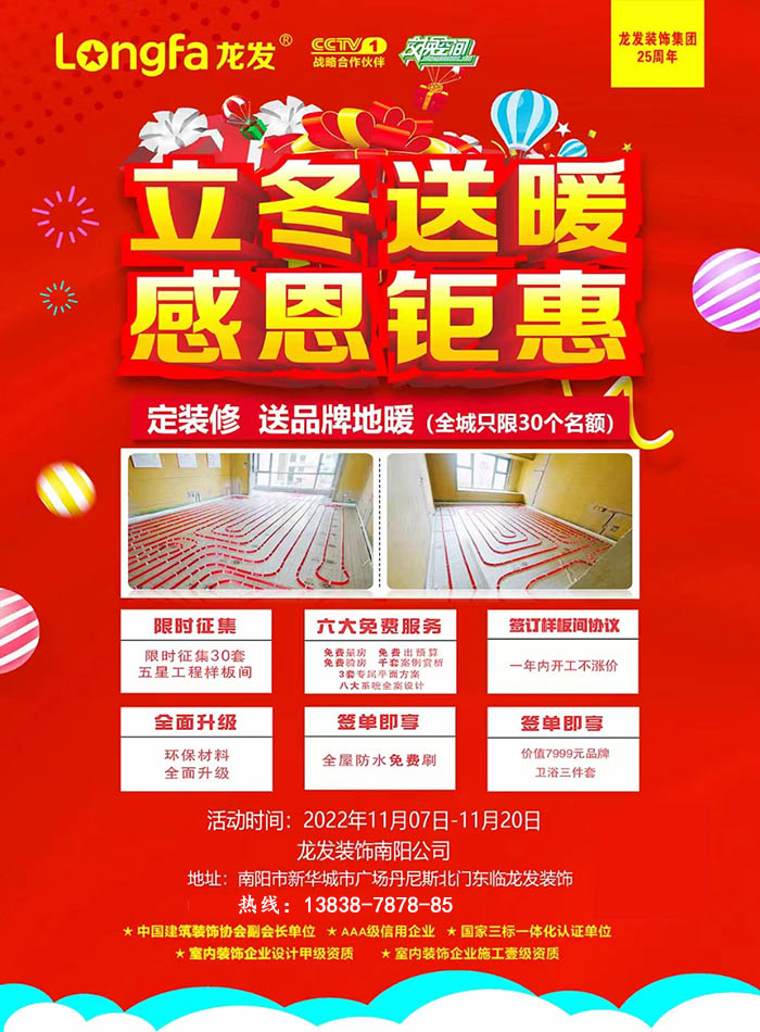 活动时间:11.07-11.20号┌─ 龙发·装饰 ─┐ 立冬送暖 感恩钜惠 定装修 送品牌地暖 这个冬天龙发装饰 ...