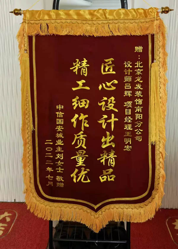 感谢美盛白河湾、建业春天里、中信国安城、东正颐和府业主为我们南阳龙发装饰送来的锦旗。一面面锦旗是荣誉,是责任,是赞许,更是对我们褒奖,这将成为龙发人继续努力的动力!龙发装饰南阳分公...