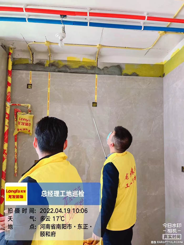南阳龙发装饰赵总和刘总对厨房的线路进行验收工作,同时也对墙砖的铺贴为客户进行验收;本套工地为东正颐和府小区使用靠尺,对墙面进行平整度的验收工作,专业的工具,才能够找到问题,简单的通...